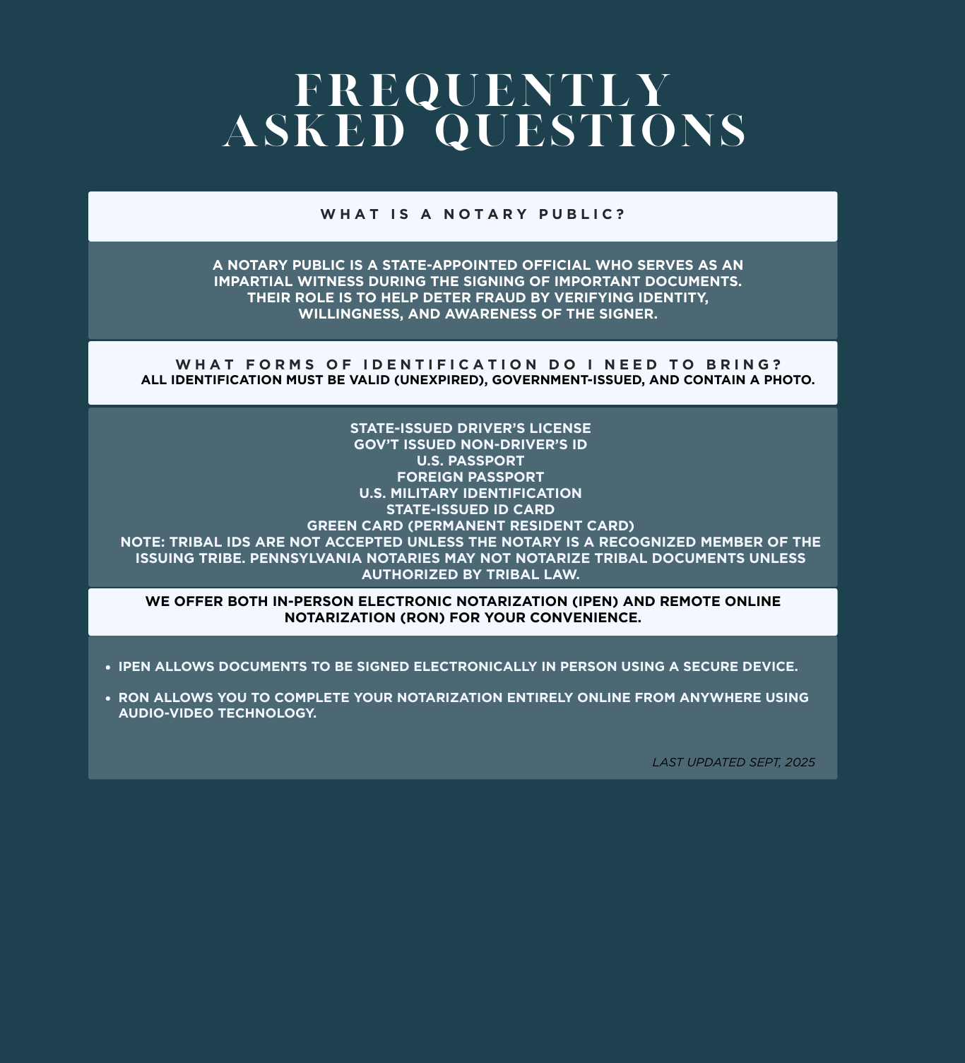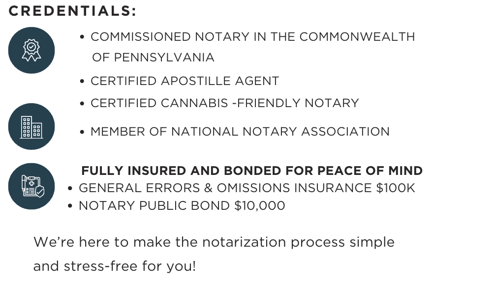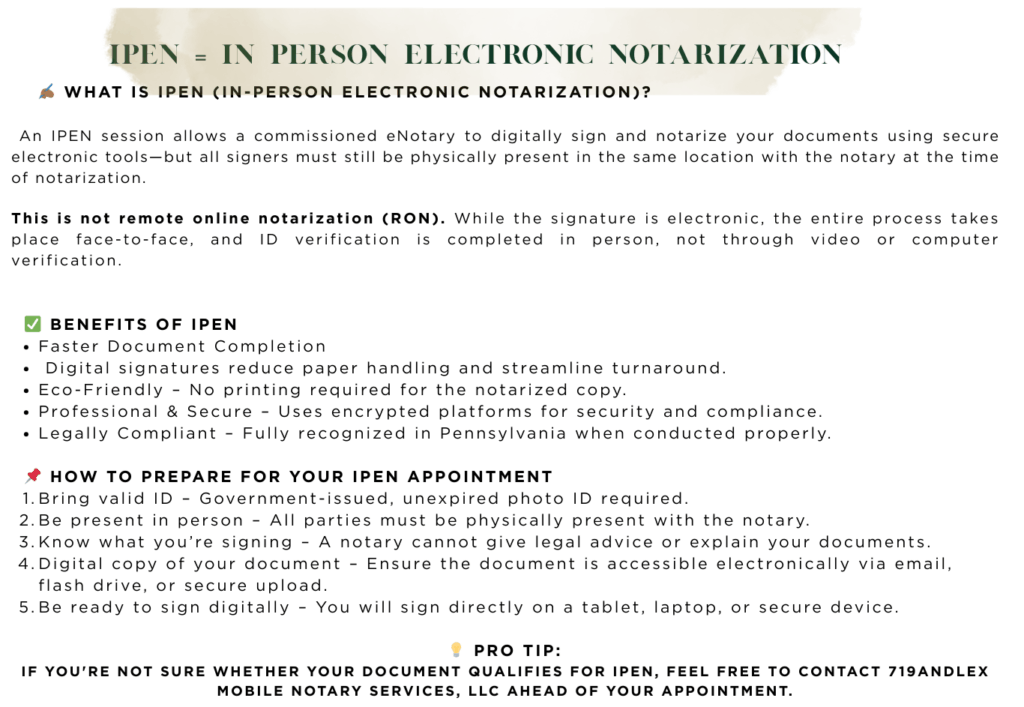 719andLex Mobile Notary Services, LLC provides Notary Public services in compliance with all applicable Pennsylvania state and federal laws.