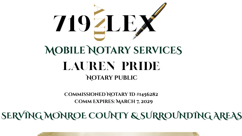 719andLex Mobile Notary Services is a Monroe County, PA-based company dedicated to making notarization accessible, efficient, and stress-free. We serve our community, including underserved rural areas, with integrity, confidentiality, and a commitment to excellence. Our business is conducted in a manner that honors God, and we strive to contribute positively to our community.